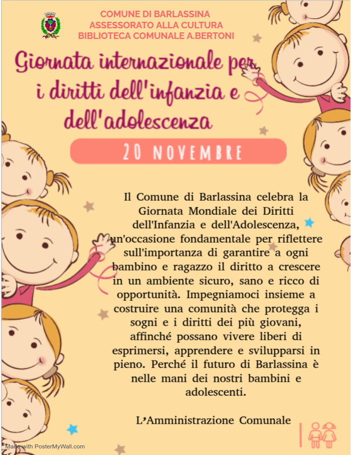 Il Comune di Barlassina celebra, il 20 novembre, la Giornata Mondiale dei Diritti dell'Infanzia e dell'Adolescenza, un'occasione fondamentale per riflettere sull'importanza di garantire a ogni bambino e ragazzo il diritto a crescere in un ambiente sicuro, sano e ricco di opportunità. Impegniamoci insieme a costruire una comunità che protegga i sogni e i diritti dei più giovani, affinché possano vivere liberi di esprimersi, apprendere e svilupparsi in pieno. Perché il futuro di Barlassina è nelle mani dei nostri bambini e adolescenti.