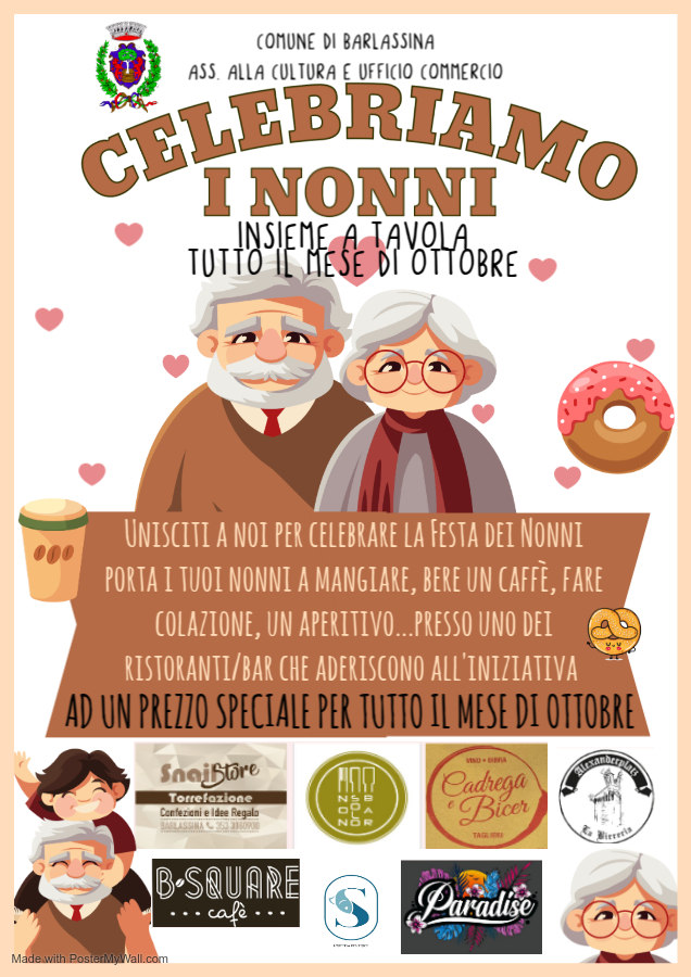 Porta i tuoi nonni a mangiare, bere un caffè, fare colazione, un aperitivo... presso uno dei ristoranti/bar che aderiscono all’iniziativa a prezzo speciale per tutto il mese di ottobre!!